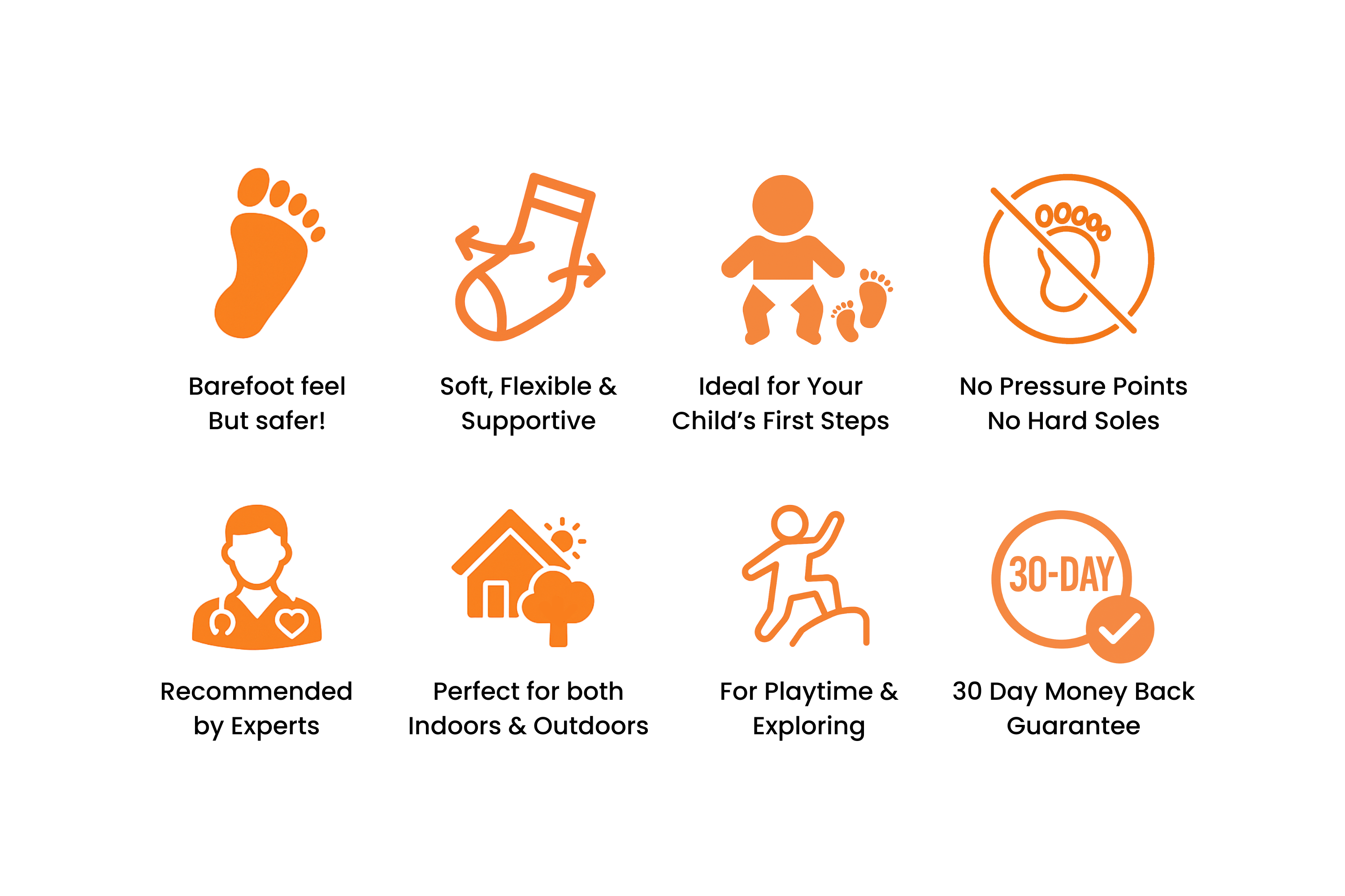 They feel like socks but provide protection and grip for outdoor and indoor play, and they stay put! They have extra room for the toes, no pressure points and no hard soles. Just as experts recommend for your baby's first steps.